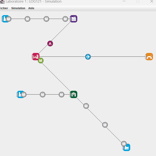 Un logiciel fait en Java, qui interprète un document xml, puis dessine une série d'usine, d'entrepôt et de chemin et commence la simulation.